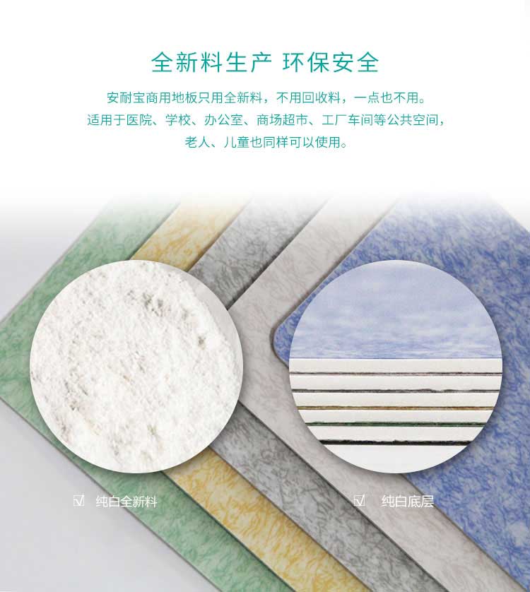 安耐宝pvc免费P站视频只用全新料,不用回收料,一点也不用。适用于医院、学校、办公室、商场超市、工厂车间等公共空间老人、儿童也同样可以使用。