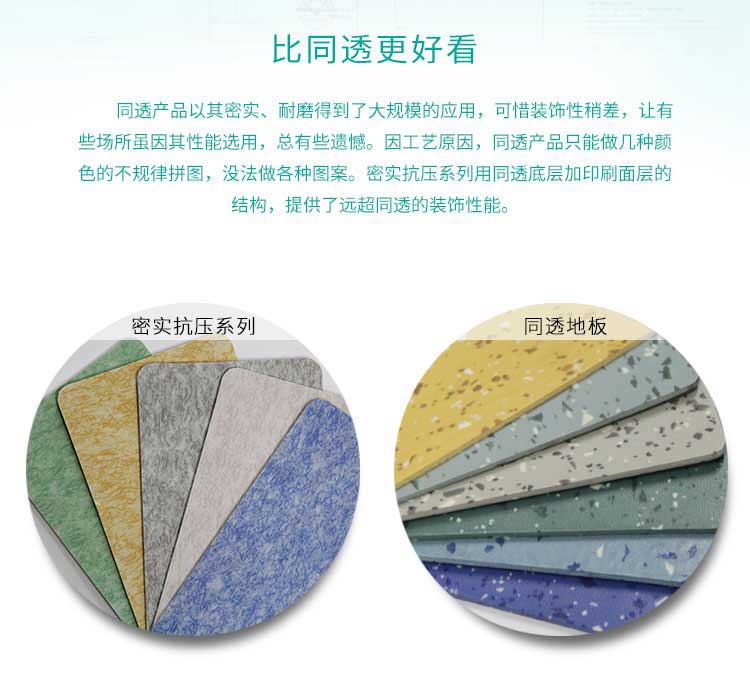 同透产品以其密实、耐磨得到了大规模的应用,可惜装饰性稍差,让有些场所虽因其性能选用,总有些遗憾。因王艺原因,同透产品只能做几种颜色的不规律拼图,没法做各种图案。密实抗压系列用同透底层加印刷面层的结构,提供了远超同透的装饰性能。
